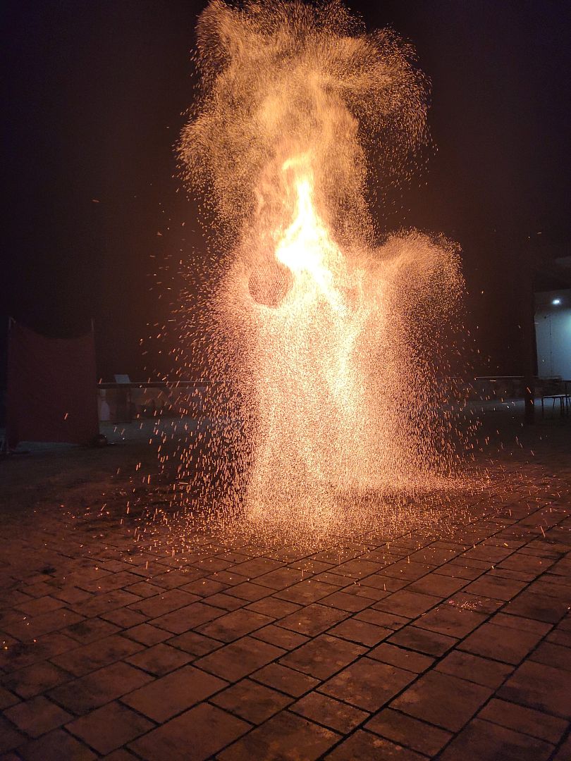 Ohnivá show se konala na venkovní terase. Na přání manžela jsme si na závěr ohňové show připravili malý přídavek. Svou premiéru si tak zažila sparkle hůl, jejíž ukázku můžete vidět zde. Hůl svou premiéru zvládla na výbornou, nikoho a nic jsme nezapálila a velké masa plamene měla úspěch.